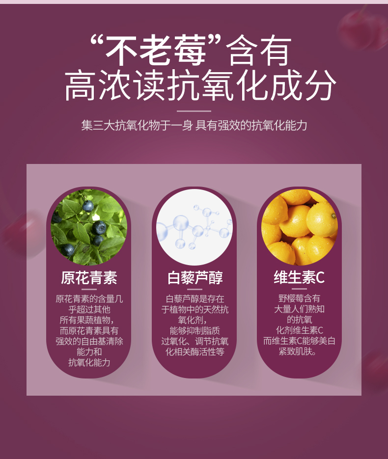 不老莓作为健康食品受到广泛关注,其中一个重要原因就是它的功效,不老莓含有的花青素是强大的抗氧化物质。其花青素的含量是蓝莓的5~25倍,而且除了花青素之外还含有大量多酚,据波兰华沙大学研究结果表明:不老莓的多酚含量是葡萄的80倍,覆盆子的20倍,蔓越莓的13倍。